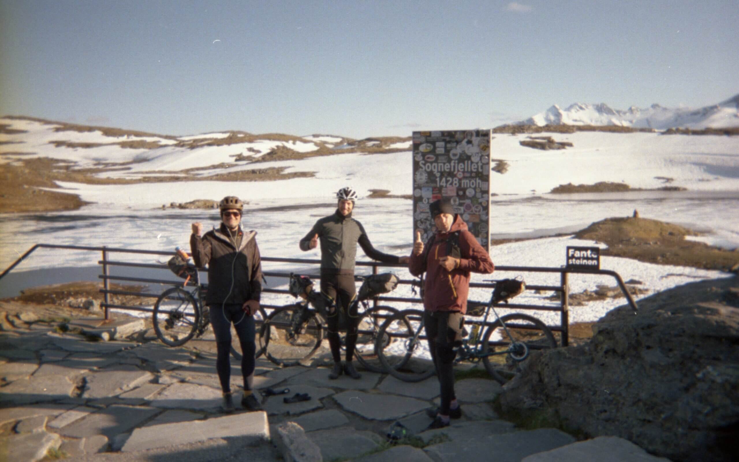 Wir alle sind total geflasht von der Umgebung als wir uns am Schild des höchsten Punktes abklatschen: hohe Berge überall um uns herum, viele über 2000 Meter hoch – und sogar Norwegens höchster Berg, der 2469 Galdhøpiggen, ragt zwischen ihnen empor! Allerdings ist jetzt am Abend ziemlich frisch hier oben, große Schneefelder säumen die Straße. Wir ziehen uns warme Klamotten, Mütze und Handschuhe an, als wir uns wieder auf die Räder schwingen.