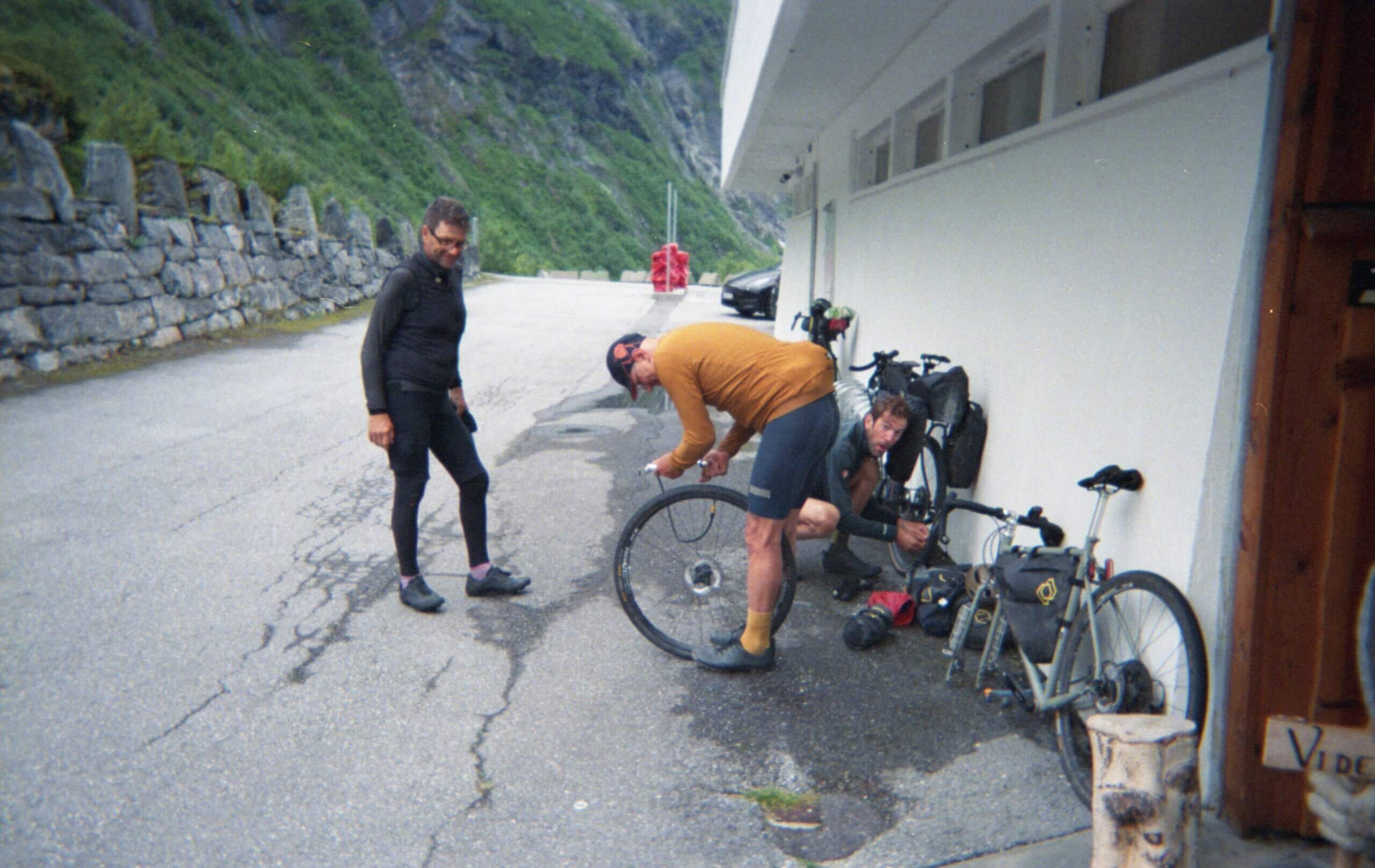Der legendäre Anstieg ist an sich nicht wirklich krass, mal abgesehen davon das es von Åndalsnes bis zur Passhöhe gut 850 Höhenmeter zu überwinden gilt. Allerdings gab es im Jahr zuvor einen großen Felssturz und die Straße ist gesperrt. Und so hat sich Justinas als besonderes Schmankerl für uns eine Hike-a-Bike Passage zurecht gelegt, die uns auf einem steilen, steinigen Wanderpfad neben der Straße den gesperrten Abschnitt quasi Umtragen lässt. Nett. Vor allem auch, weil das letzte Stück dann auch noch besonders steil und dank eines Wasserfalls direkt nebenan auch schön rutschig ist. Ein paar Ketten sichern den Abschnitt, was die ganze Sache auch nicht viel besser macht. Wir denke lieber erst morgen früh darüber nach, was uns da wirklich erwarten wird. In der Nacht und total übermüdet wollen wir die Sache allerdings nicht angehen. Daher werden wir in Åndalsnes gut 10 Kilometer davor übernachten.