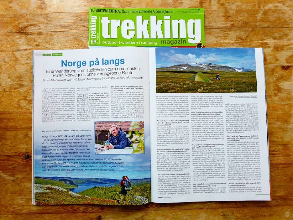 In der aktuellen Ausgabe des Trekking-Magazins durfte ich Silke und Thomas Rede und Antwort zu meiner langen Wanderung über 140 Tage durch Norwegen stehen. Wir saßen lange beieinander und es hat mir richtig viel Freude bereitet zu erzählen, ich bin dabei richtig ins Plaudern geraten. Umso mehr freue mich nun, dass fertige Interview gedruckt im Heft zu sehen und zu lesen. Ich wünsche euch viel Spaß beim Schmökern und träumen, von Norwegen, vom Losziehen und vom Fernweh! Hier geht’s zum kompletten Interview!