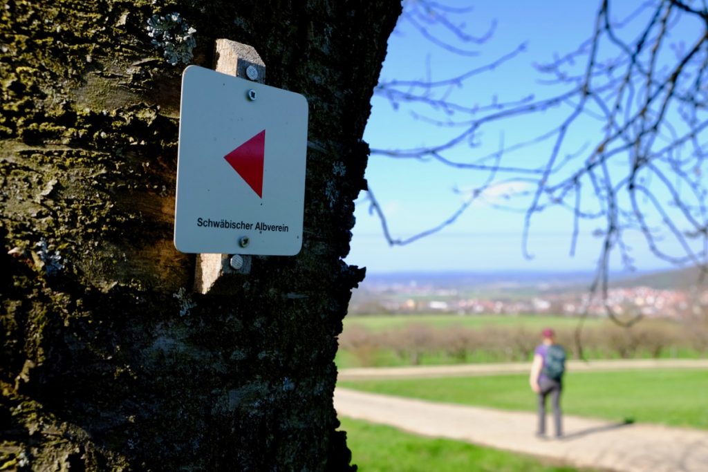 Wir folgen also den HW1 Schildern und gelangen bald schon hinaus aus dem Städtchen. Der Weg wird uns von nun an bergan in Richtung des Dörfchens Hülben führen. Der Anstieg ist gemächlich, lässt sich gut gehen und bietet einen herrlichen Ausblick zurück auf das morgendliche Bad Urach.
