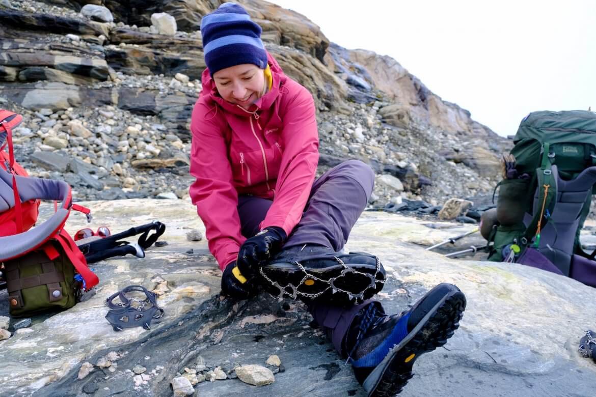 Zurück zur zusätzlichen Ausrüstung für den Gletscher. Da für uns nicht in Frage kam ein Seil, Steigeisen mit entsprechenden Schuhen und Eispickel mitzuschleppen haben wir uns entschlossen, es wie vor einigen Jahren lediglich mit Grödeln an den Schuhen zu probieren. Also hatten wir diese mit im Gepäck, vom Gewicht her vertretbar und für die Art der Tour sicherlich die beste Wahl. Auf den steileren Abschnitten dieser Etappe waren die Grödel Gold wert und haben sich wie erwartet als äußerst zuverlässig erwiesen und auch im steilen Eis hervorragenden Halt geboten. Um unterwegs unsere Route etwas ausspähen zu können, hatten wir diesmal auch ein kleines, leichtes Fernglas mit dabei. Auch das war eine gute Wahl, so konnten wir auch weiter entfernte und mitunter etwas dürftige Markierungen gut in der Landschaft finden.